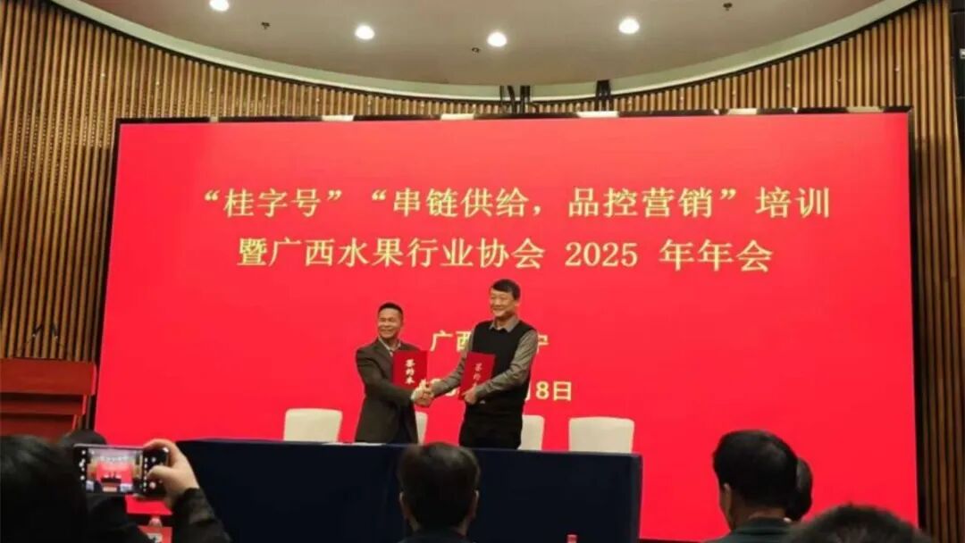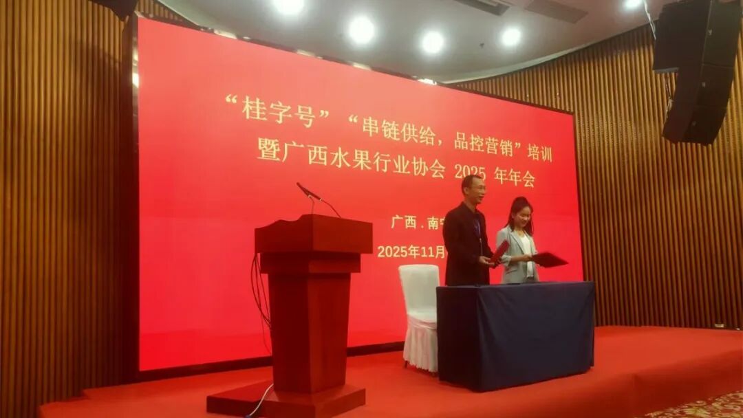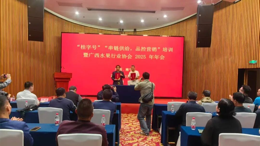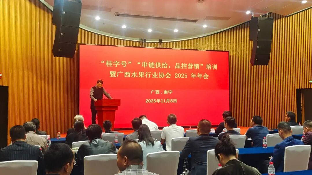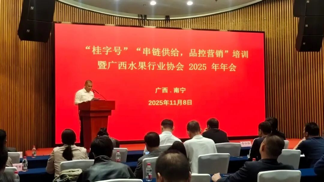 由自治区农业农村厅主办,自治区水果技术指导站委托,广西水果协会承办的中国—东盟水果展区11月6—9日在南宁国际会展中心开展,结合进行的专项活动“桂字号”“串链供应,品控营销”培训暨广西水果行业协会2025年年会于8日在展馆会议室召开,来自区内的参展种植企业、受邀采购商、水果协会理事和部门专业工作人员和学者参加了会议,自治区水果技术指导站、绿色食品发展站、广西特色作物研究院领导和专家出席会议。